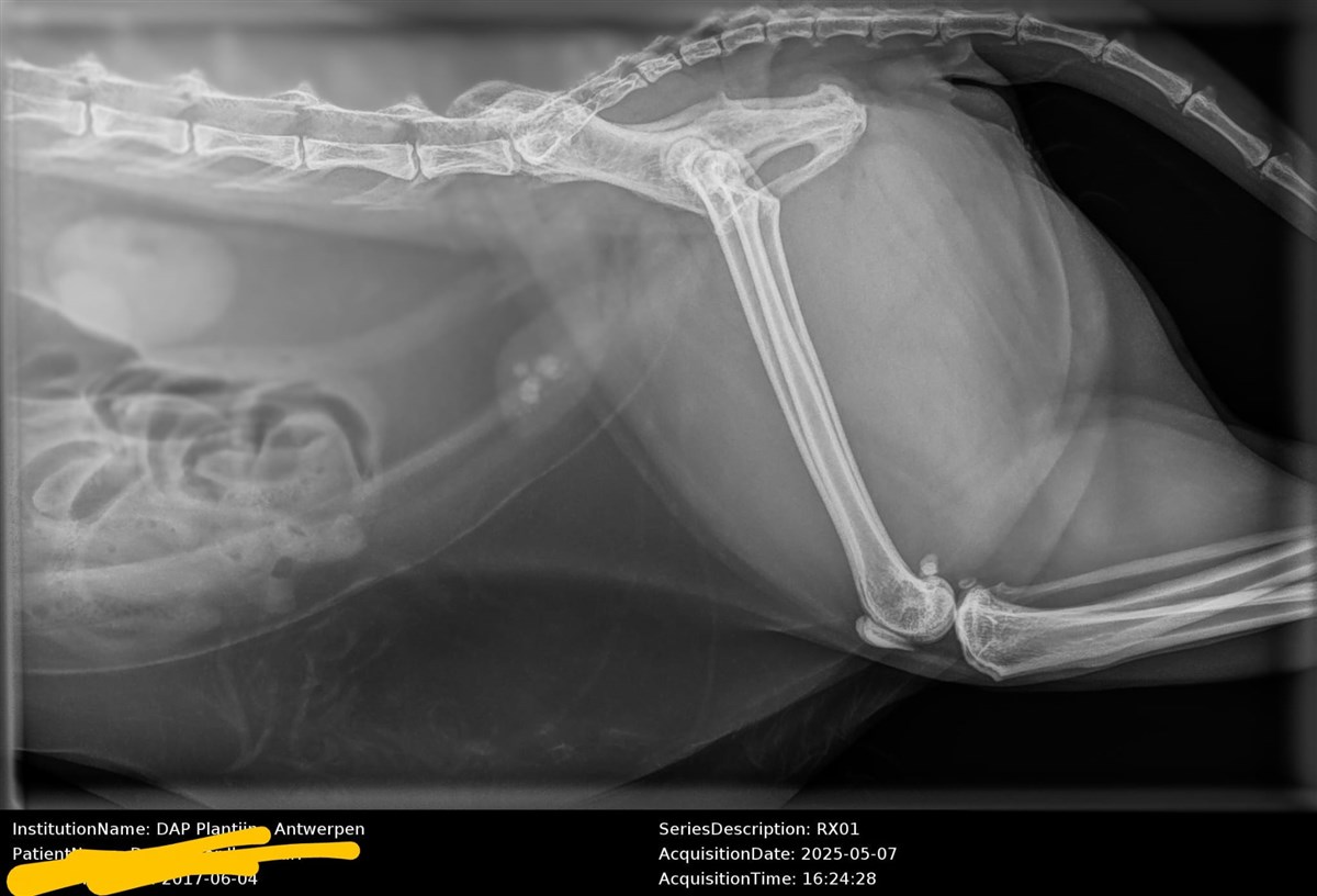 Bij de dierenarts werd vastgesteld dat Xari blaasstenen heeft. Zonder operatie komt haar leven in gevaar. De ingreep kost €600 - een bedrag dat het gezin momenteel onmogelijk zelf kan opbrengen.