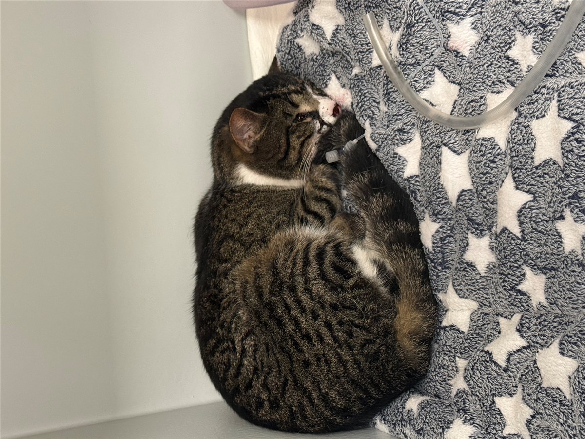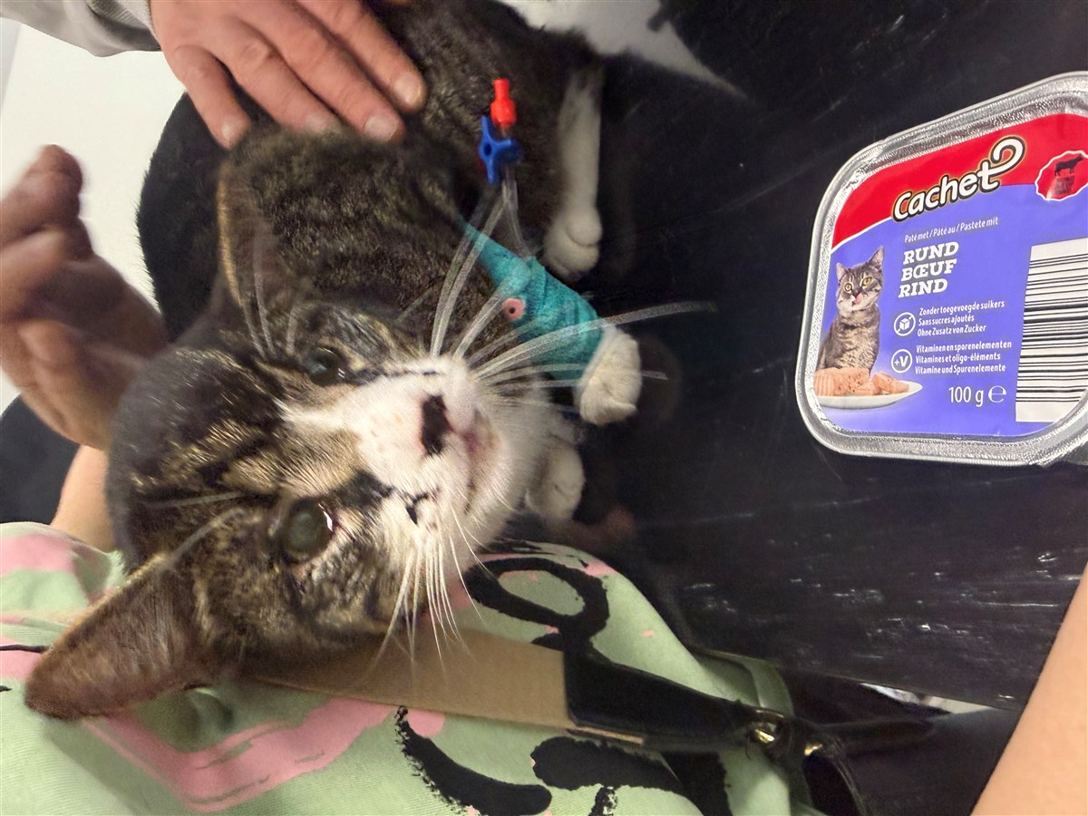 Bella is onlangs aangereden en heeft daarbij een ernstig hoofdtrauma opgelopen. Ze ligt momenteel in het dierenziekenhuis en haar toestand is zorgelijk. Haar zuurstofgehalte gaat op en af en ze is nog erg zwak.