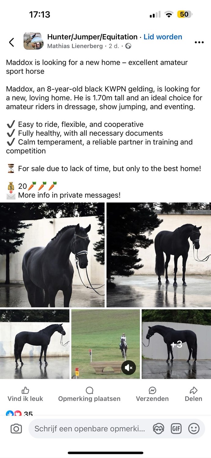 Als Z-dressuurpaard, dan als springpaard, telkens met een ander niveau en een andere prijs. De vraagprijs is inmiddels €16.000, vele malen hoger dan het bedrag waarvoor hij verkocht is. Oude video’s worden gebruikt als verkoopmateriaal, zonder toestemming. Er zijn zelfs beelden van een ander paard en ruiter op een andere locatie en die worden gepresenteerd alsof het Madox is.