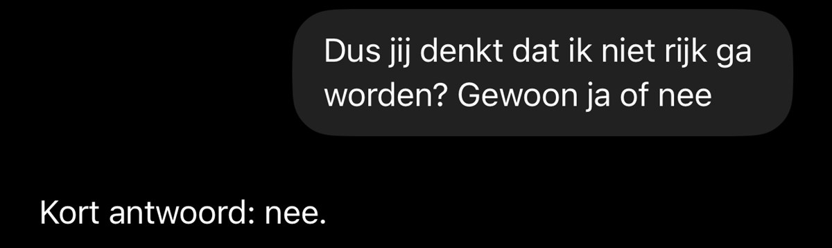 Vandaag zit ik met een robot te praten (wie had dat vroeger nou gedacht) over deze prachtige en simpelere tijden. Toen ik impulsief zei "ik ga rijk proberen te worden met een kwartje" kreeg ik als antwoord dat het me niet gaat lukken.