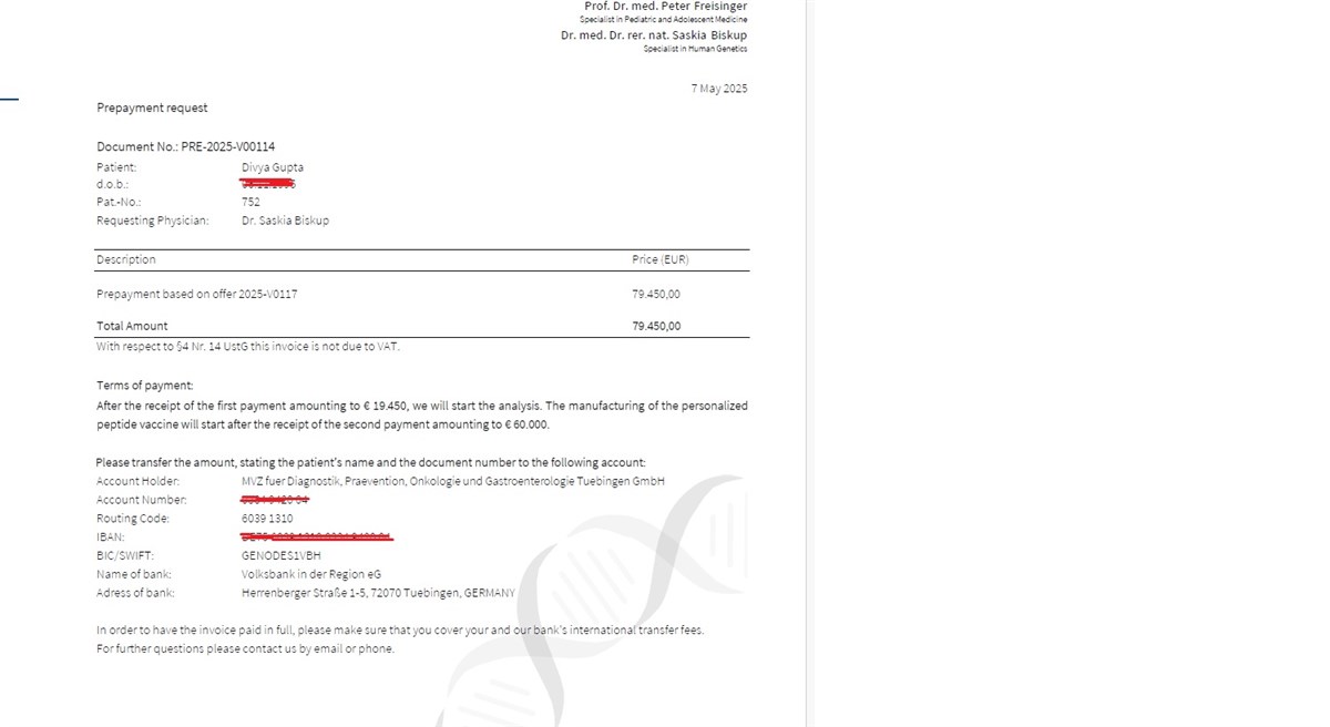 The cost of the initial trial for this life-saving treatment is €85,000 for around a year of vaccines (attaching the latest invoice from CeGat) & the cost of traveling every month for the treatment, a sum beyond the reach of Divya and her family. We believe that with the support of our community, we can raise these funds and give Divya the chance to pursue this critical treatment in July. Last year, with this fundraiser, We received around €40,000 from which we made an initial payment of 20k Euros to initiate the process and we would need to pay the remaining €60,000 Euros after 5 weeks when they start to manufacture the vaccine, and we are really looking forward for all your support once more.