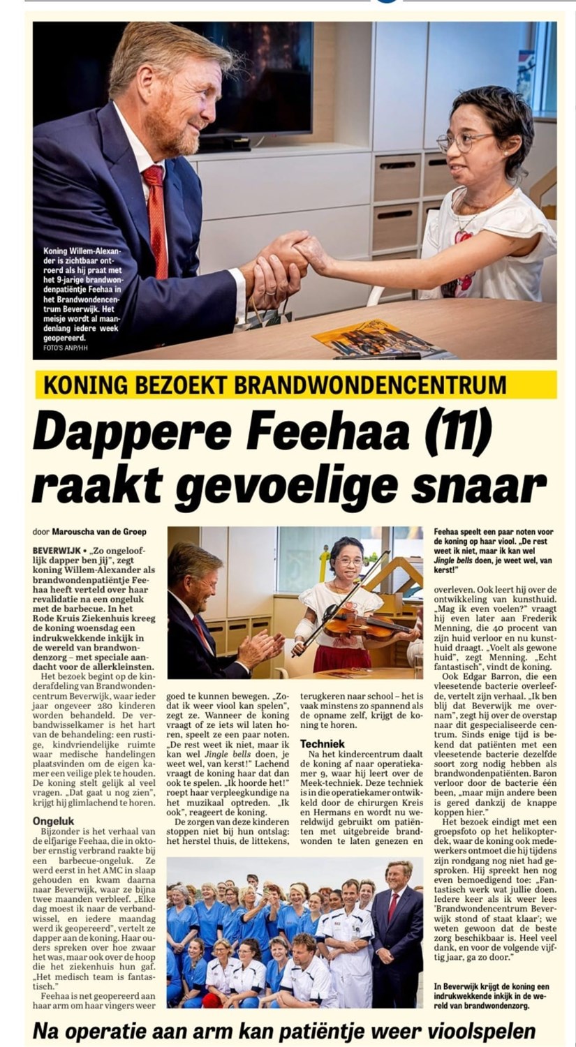 Een opname in het AMC ziekenhuis op de IC is de start van een langdurige periode van hoop en vrees, wat kan Feehaa straks allemaal nog, gaat ze het überhaupt levend halen.... Na een paar weken ontwaakt ze gelukkig uit haar kunstmatige coma, deels behandelt en geopereerd aan diverse urgente plekken, keren functies van haar lichaam weer terug. Haar lichaam zelf heeft een lange herstelperiode voor de boeg. De schrik om haarzelf te zien is groot.... Het gaat door merg en been om zo’n mooi, jong , geweldig lief kind geknakt en gebroken te zien in haar leven...... wat een intens drama! Veel operaties waarbij er huid wordt weggehaald op plekken waar het kan op Feehaa’s lichaam en getransplanteerd wordt op verbrande plekken. Haar mooie lange haar is ook verdwenen om het herstel op haar hoofd te laten plaatsvinden. Een meisje ontdaan van haar trotse lange mooie haren, een meisje die niet meer lacht , die zorgen heeft over de dag van morgen en of mensen nog wel met haar willen praten en spelen.Wat een verdriet, wat een heftige verandering. Een shock, maar ook een hele opluchting dat ze nog leeft.