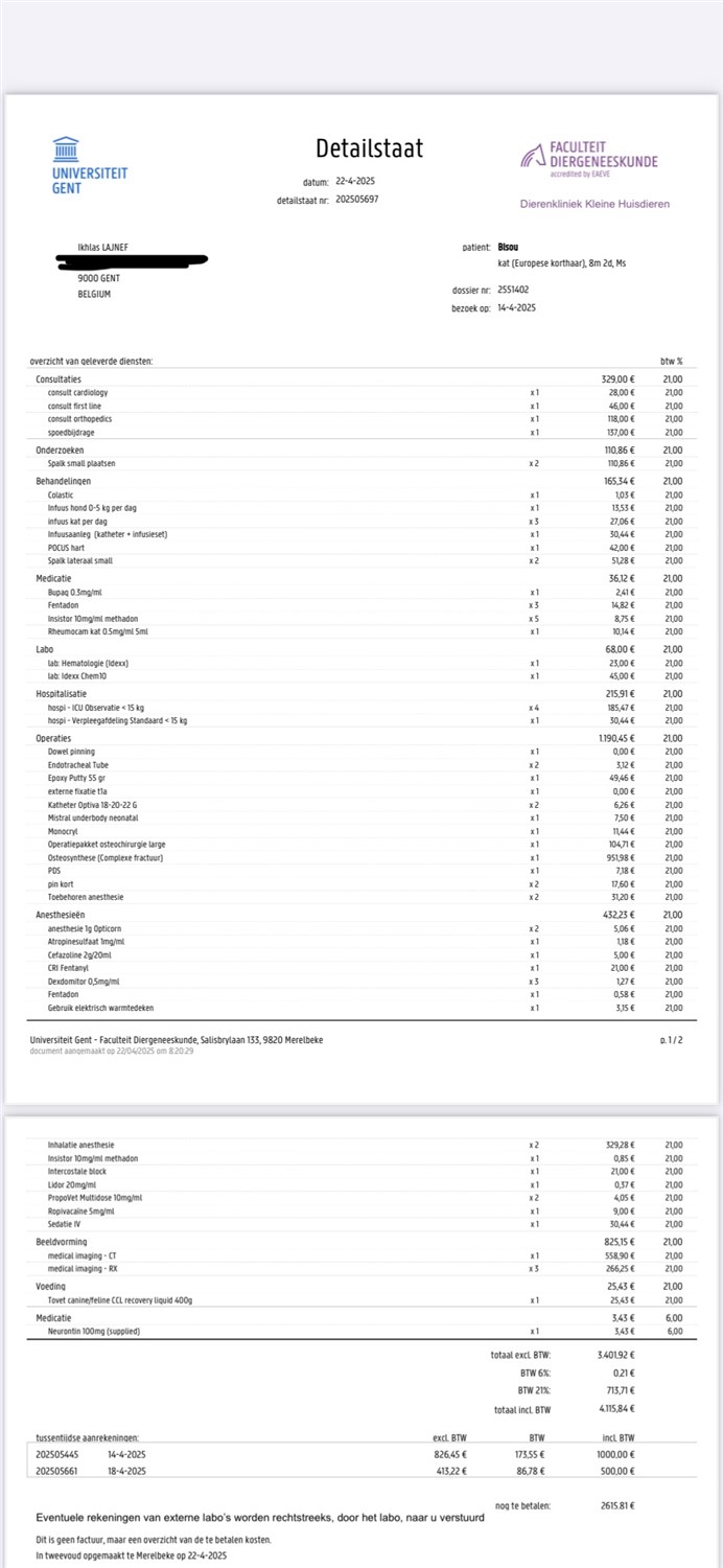 De kosten zijn enorm — de dierenarts spreekt van 2000 euro. Dat bedrag kunnen wij helaas niet zomaar betalen. Daarom vragen we hulp.