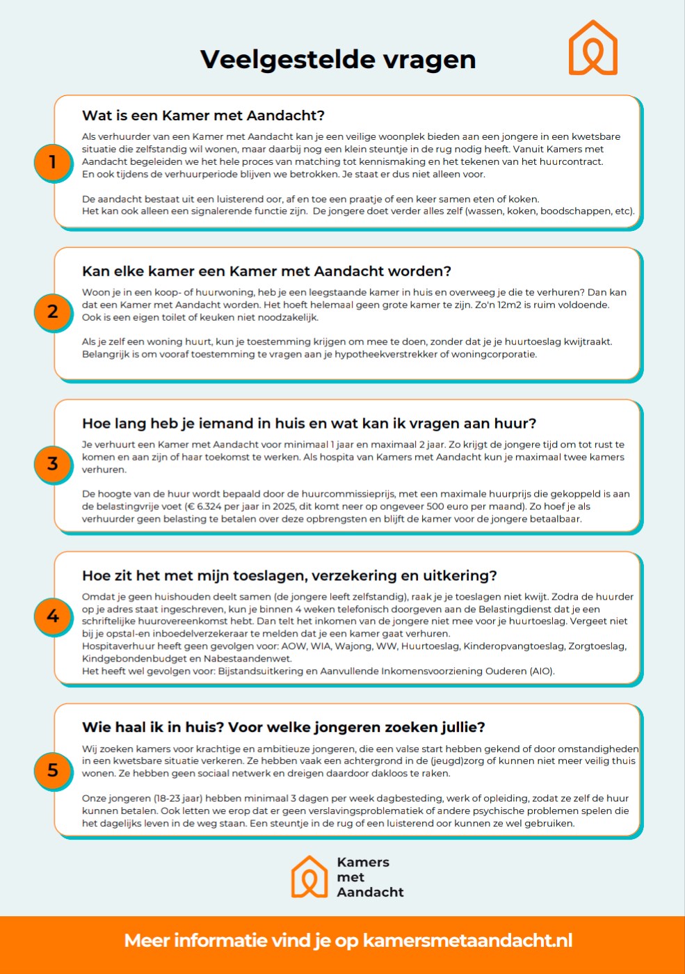 Dit alles wordt ondersteund door "Kamers met aandacht". Zij zorgen voor onderdak voor jongeren tussen de 18 en 23 jaar die een valse start hebben gehad en net nog wat extra aandacht kunnen gebruiken in hun weg naar zelfstandigheid.