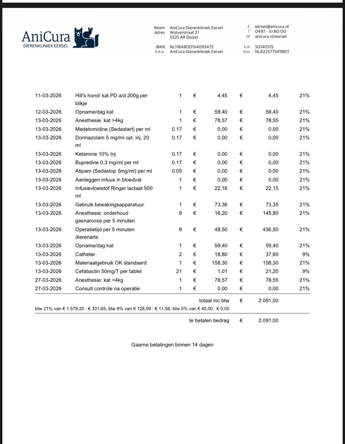 De kosten van deze spoedbehandeling en operatie zijn echter €2091,-.