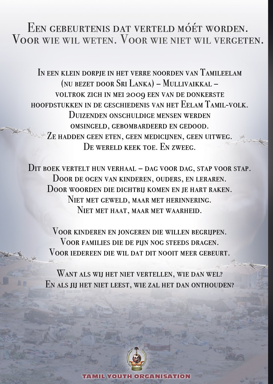 In remembrance of the Mullivaikkal genocide, a 56-page book titled "Mullivaikkal Kanji" has been created by the Tamil Youth Organisation to pass on the memory to future generations.As a first step, we are printing 500 copies and organising their distribution among Tamil youth in Belgium and the Netherlands. We kindly and earnestly request your support for this initiative undertaken by the Tamil Youth Organisation. If you would like to help, please donate an amount through this website.